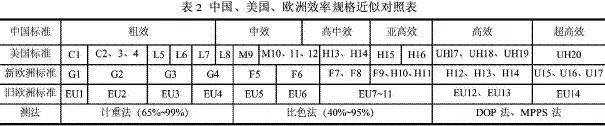 (2)嘿嘿视频在线观看效率分类过滤效率是在特定测试方法下的测试值,在标记效率值时必须注明相应的测试方法,不同的国家有不同的表示方法,见表2。