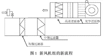 此外,为解决由于通过各个高效嘿嘿视频在线观看的风量不同而引起的个别循环空调机中的高效嘿嘿视频在线观看更换的频度高的问题,可以在新风机中加装化学嘿嘿视频在线观看和亚高效嘿嘿视频在线观看,将新风集中处理而不是将新风送到各循环风机中再进行处理,以减少由于各个循环风机风量的不同而增加的更换量。此问题已经在我公司的新工程中得到了改善。在201#栋的新工程中新风空调机组采取的新流程如图1所示。